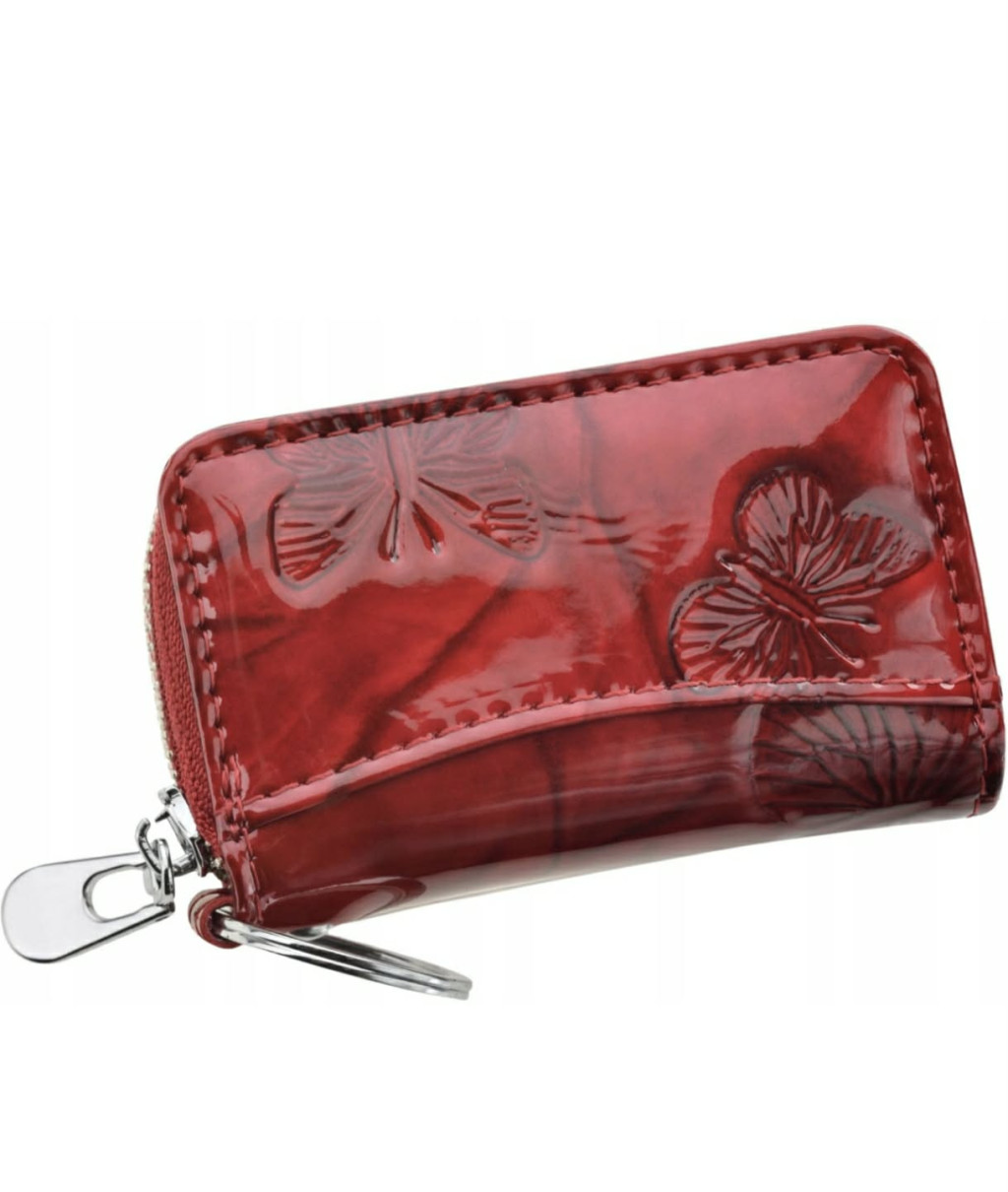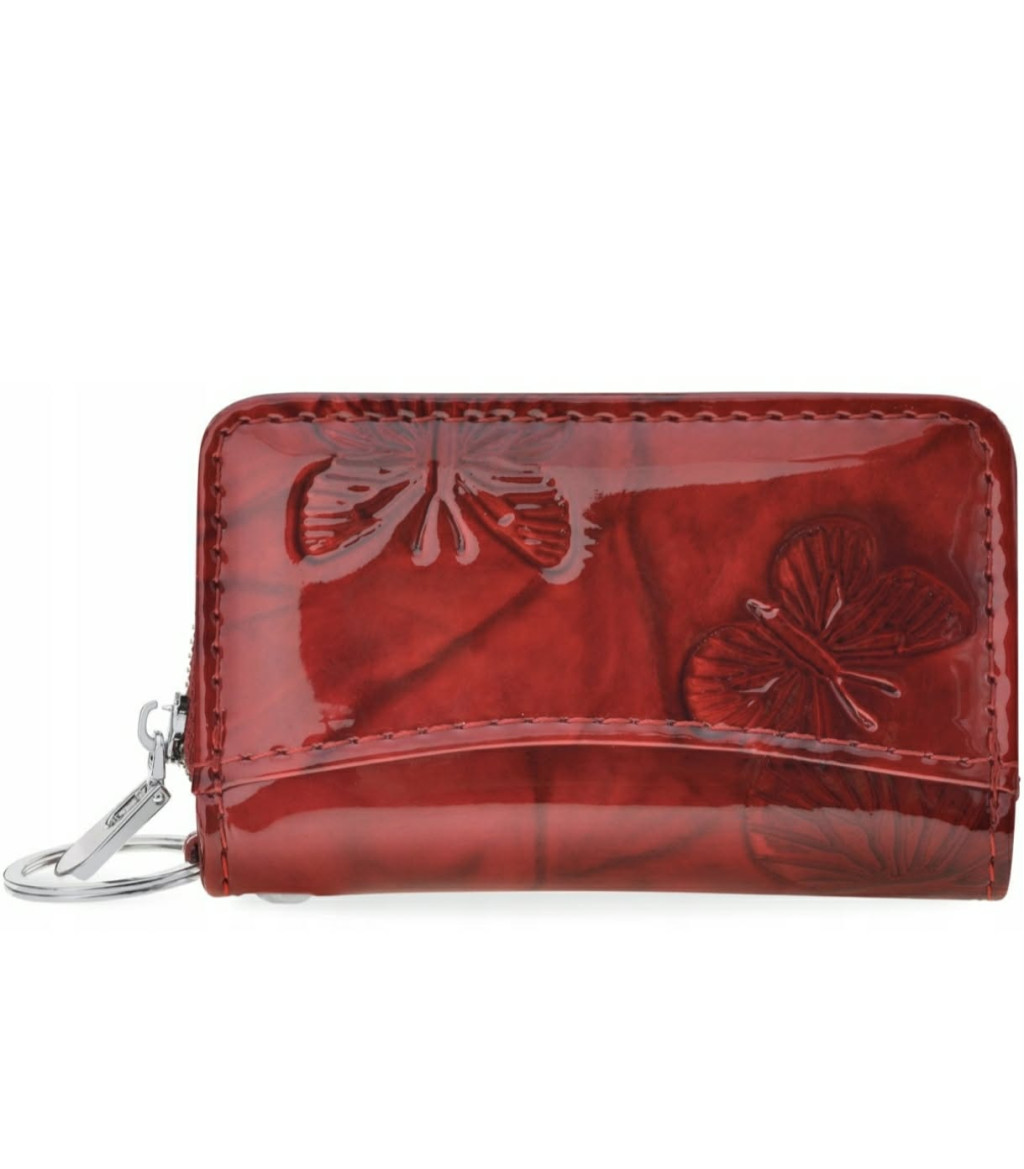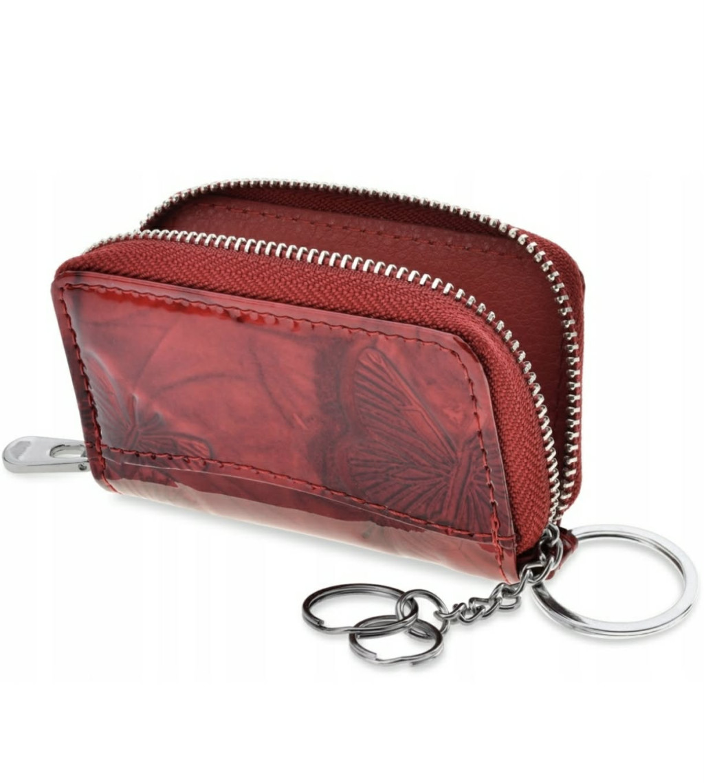 Bőr kulcstartó női cipzáras piros lakk pillangós