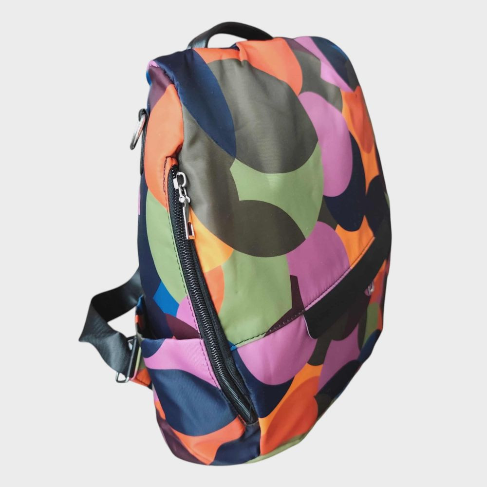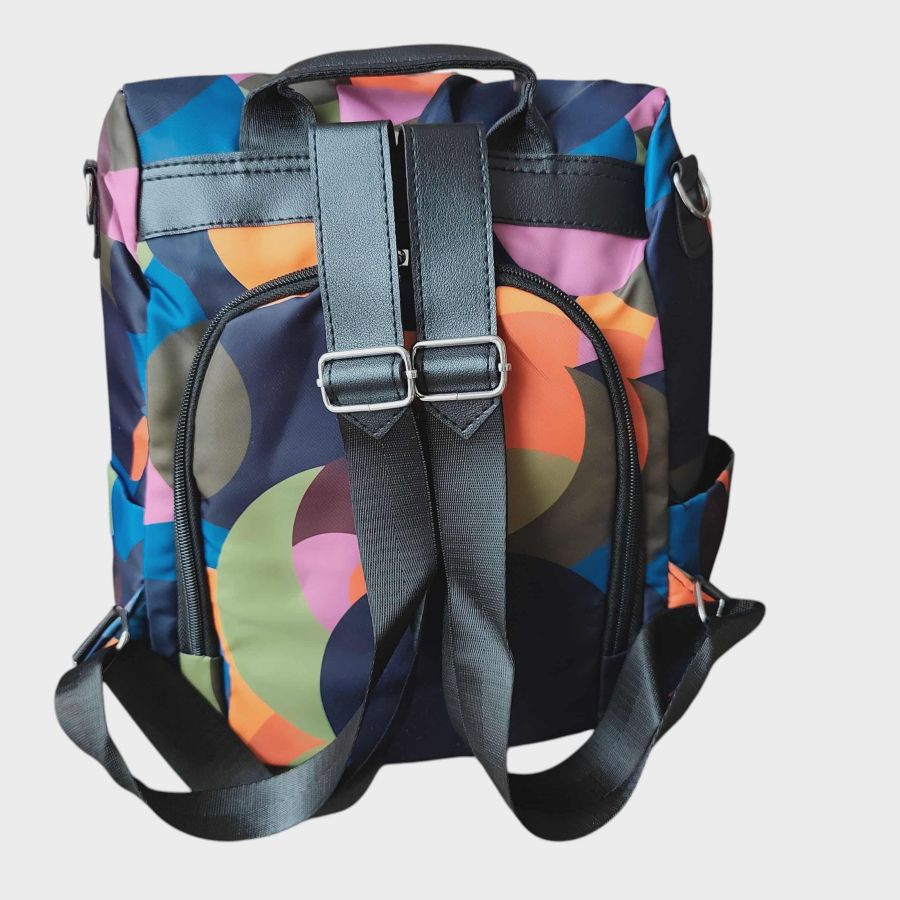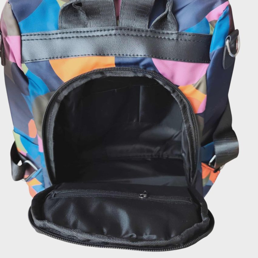 Női hátizsák egyedi színes stílusban, lopásbiztos kialakítással.